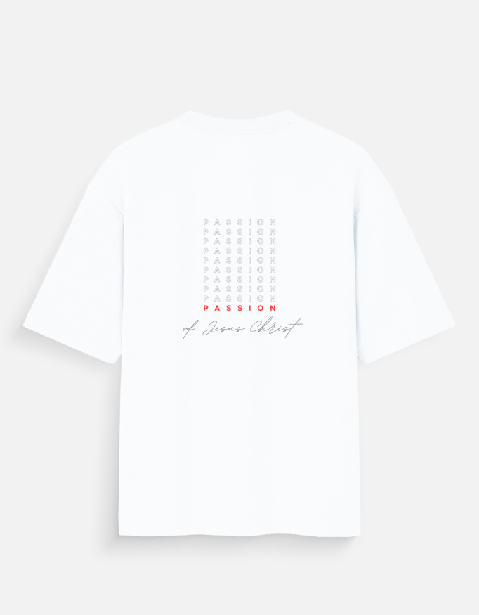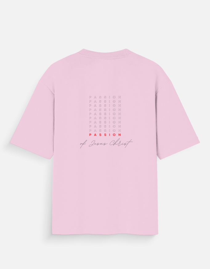 When you look at the back of the shirt, it shows a beautiful and comforting message. In the middle, you will see the word “PASSION” repeated in a tall, clean stack of soft letters. At the very bottom of this stack, the final word “PASSION” stands out beautifully in a bright, warm color. Right below that, you will read the words “of Jesus Christ” written in a very elegant and flowing handwritten style. This lovely design shares a strong and deep message of faith that looks wonderful and modern.